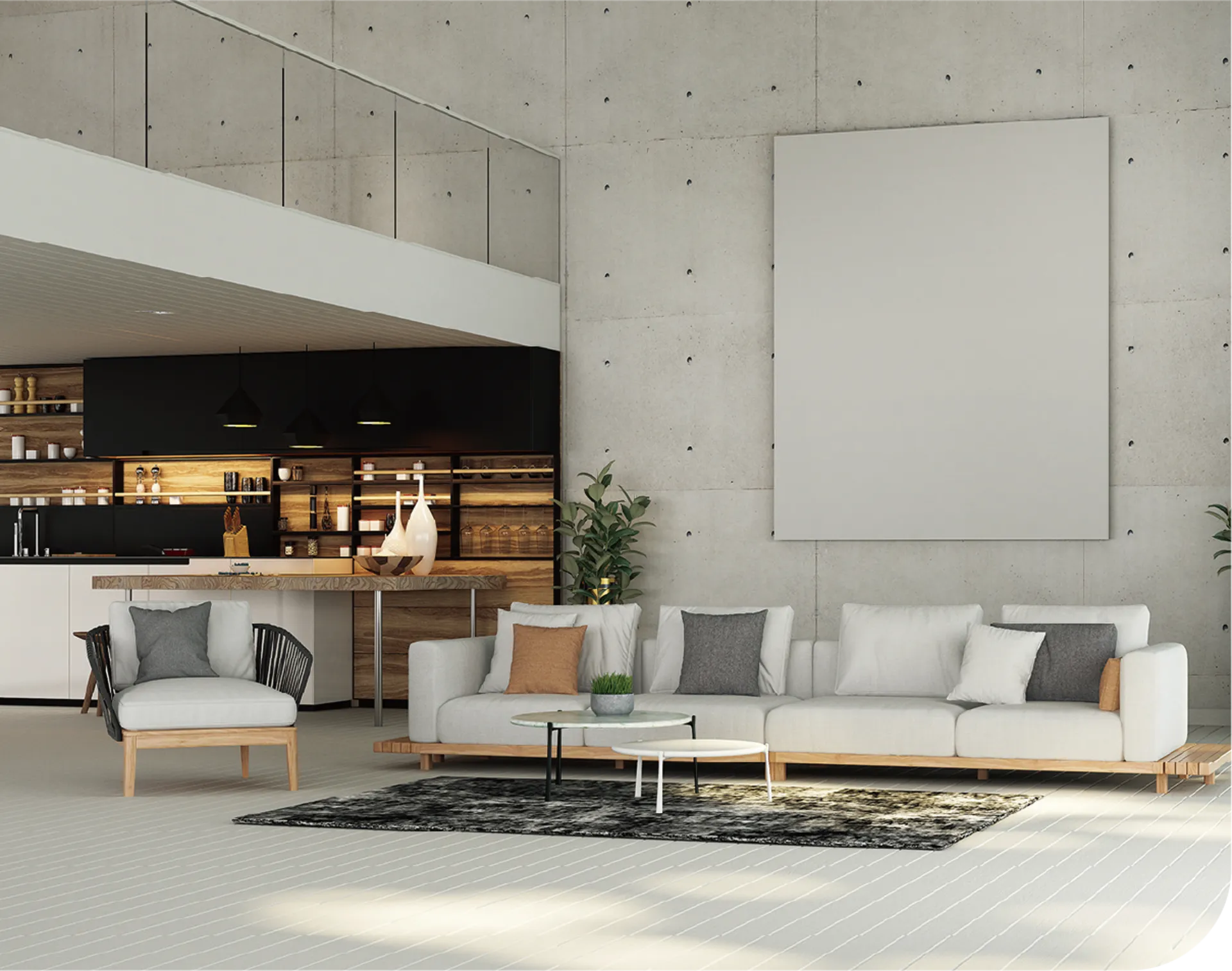 コンクリートでつくられた家は、無機質でクールな質感からスッキリとした現代的な雰囲気を醸し出します。コンクリート住宅だから出来る設計はいくつかあります。すっきりと開放的な印象で、仕切りがあまりなく家族がいつも同じ空間で一緒に過ごせる温かみのある住まいが実現できます。