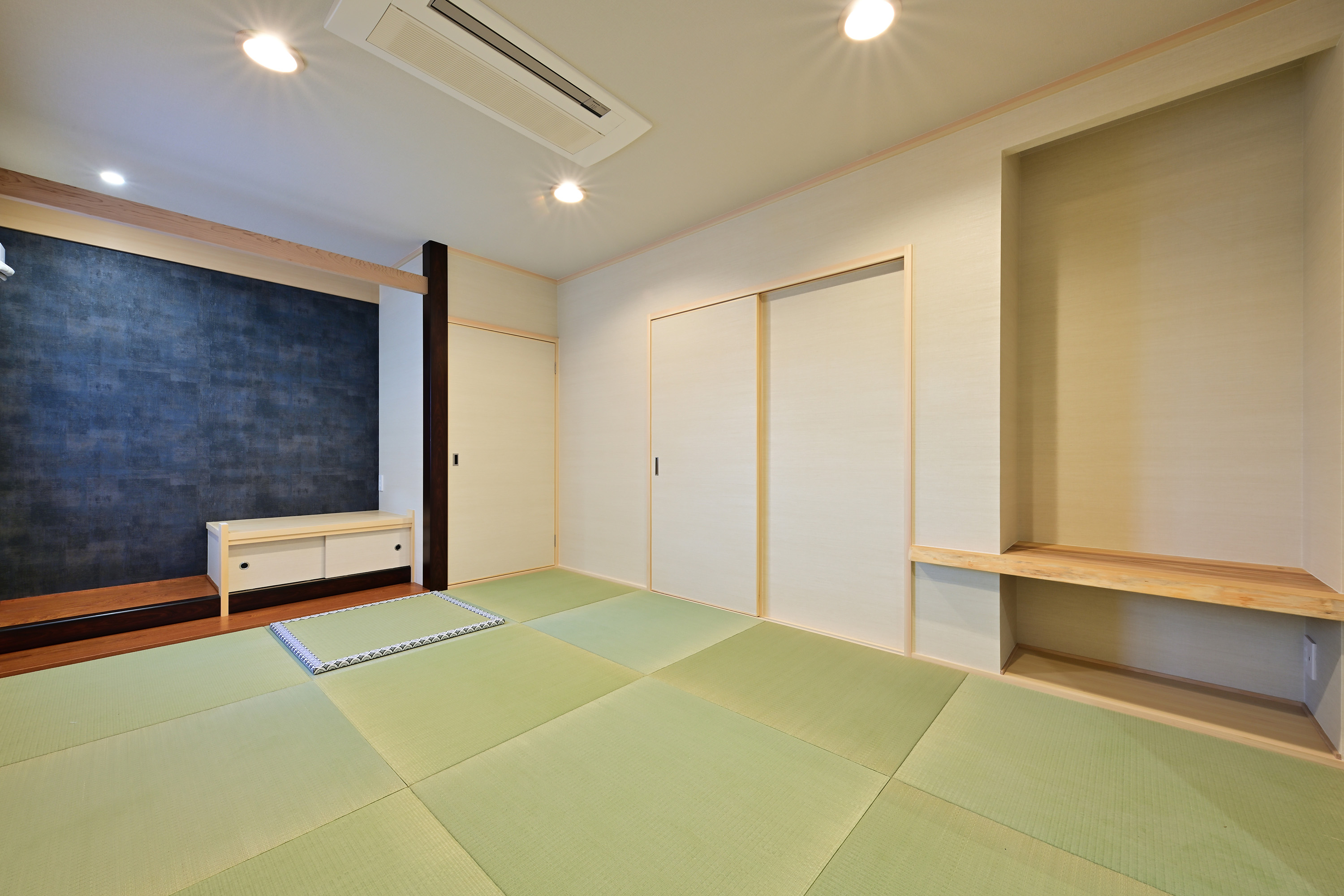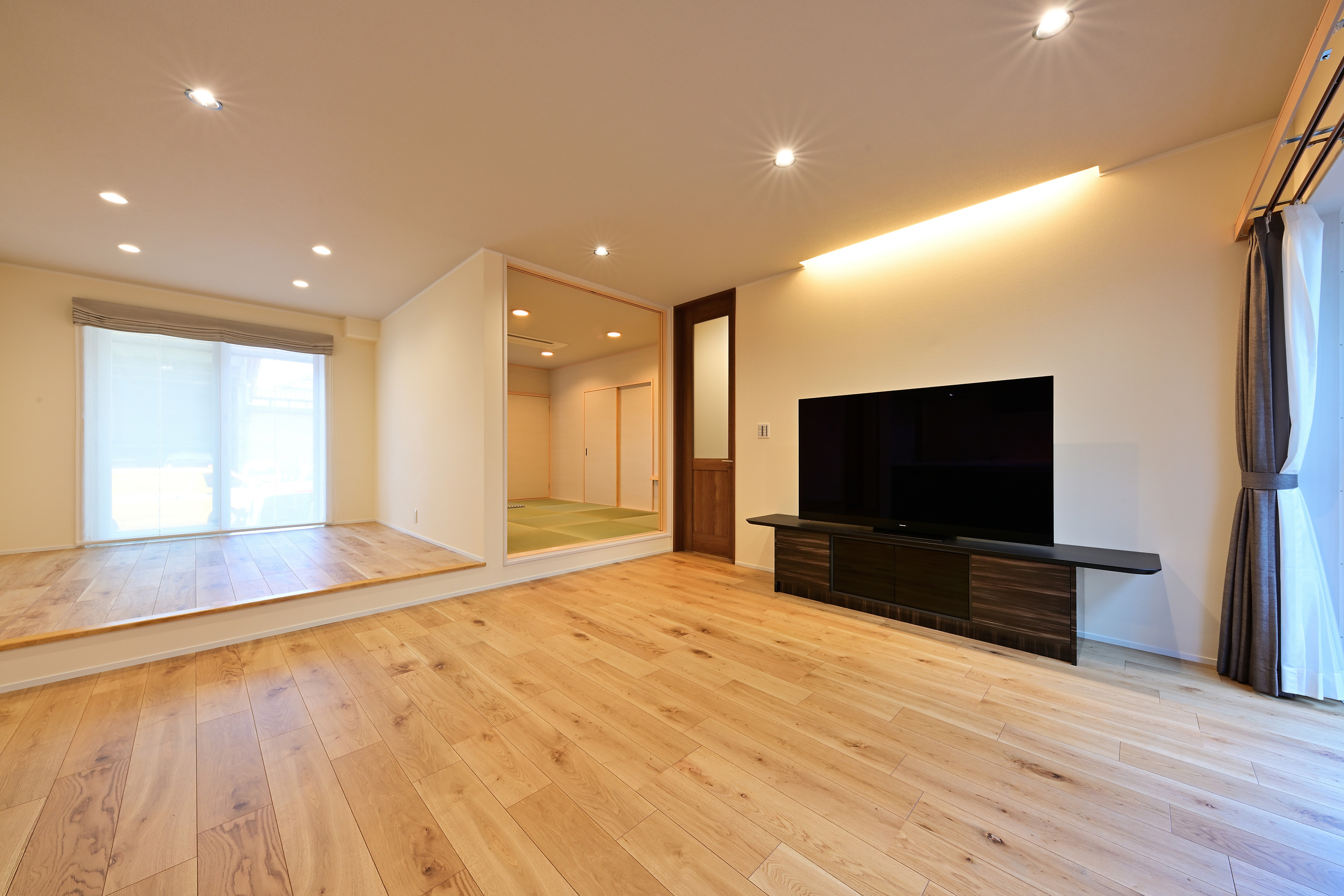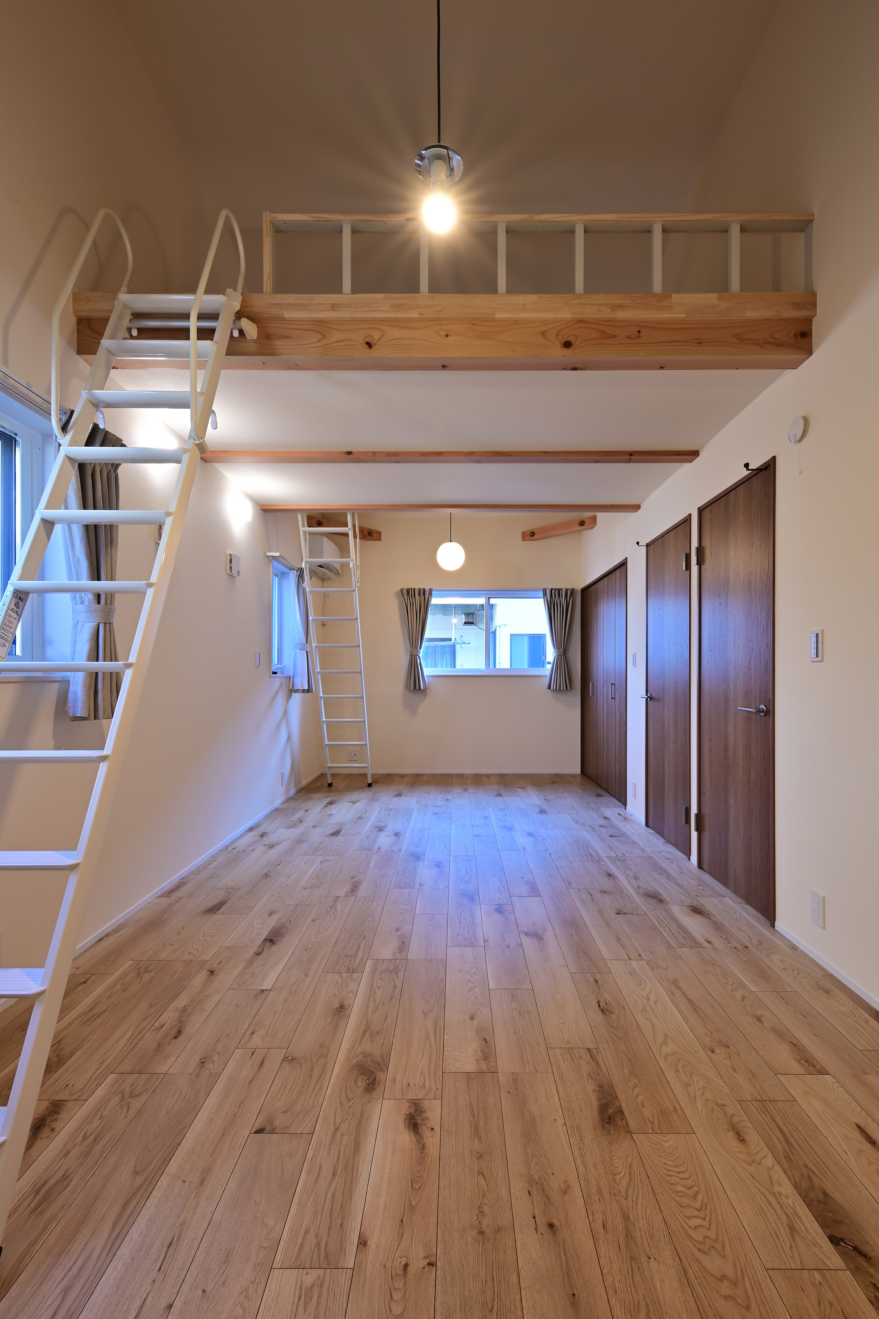 ご夫婦とご両親の二世帯住宅です。キッチンや浴室は一つですが、2階にはご夫婦世帯の洗面所や広いリビングスペースを確保し、交流とプライベートを両立した住まいを実現しました。また、限られたスペースを有効活用する為、子供部屋はロフトを付けて将来2つに区切る予定です。1階は落ち着きのあるシックな空間に、2階は開放的な空間に仕上げ、家族のこだわりを叶えながら、程よい距離感と安心感が同居する住まいとなりました。