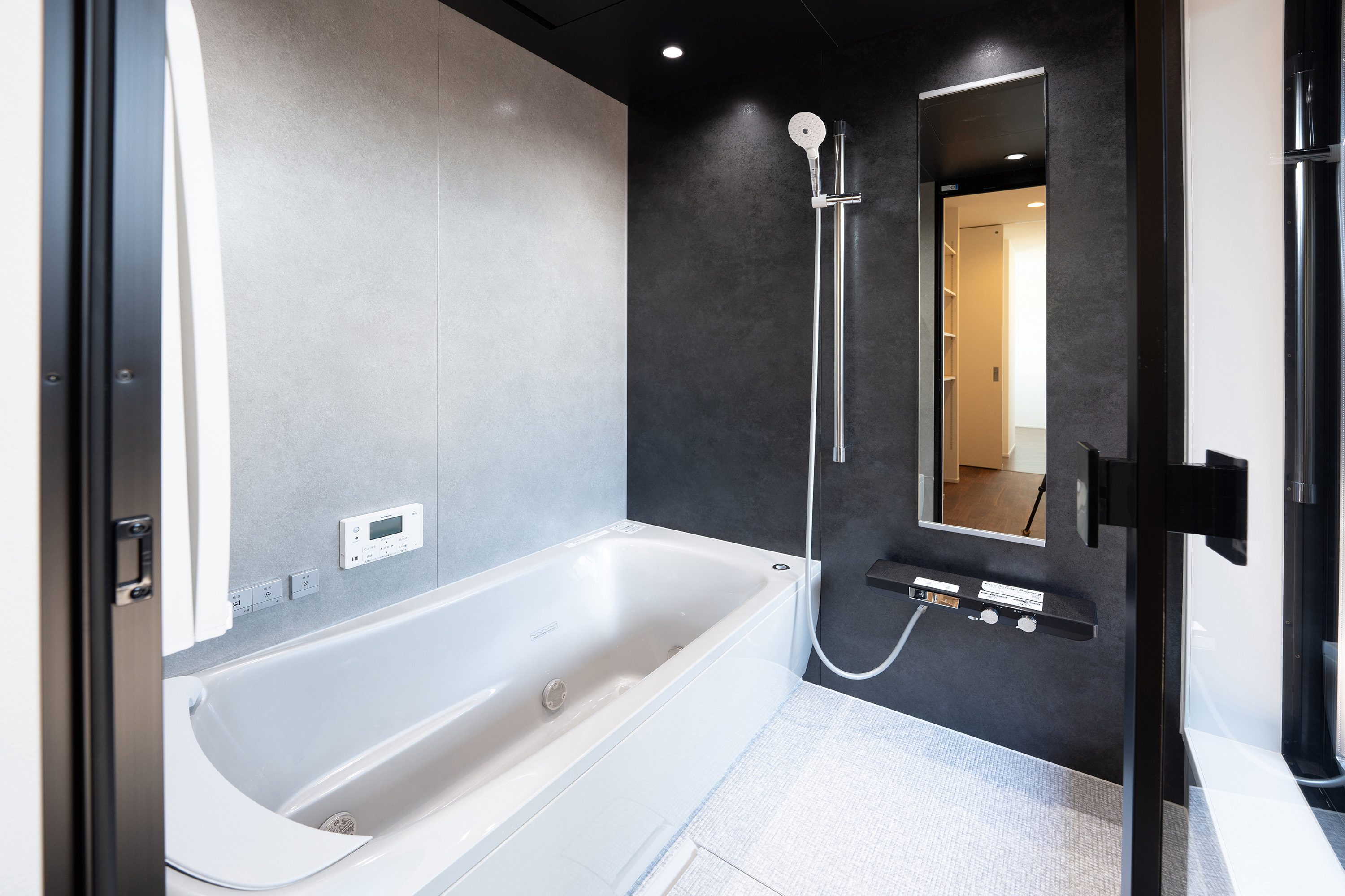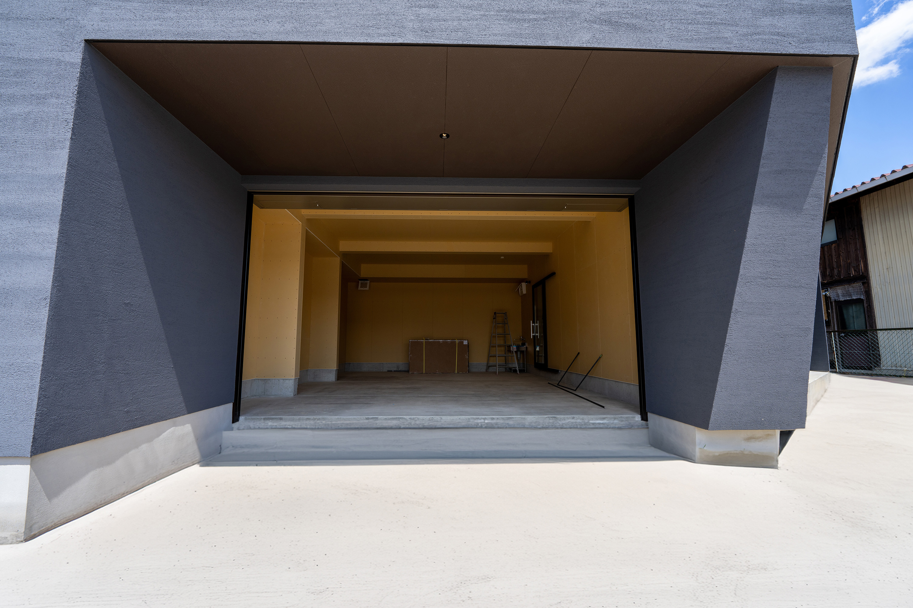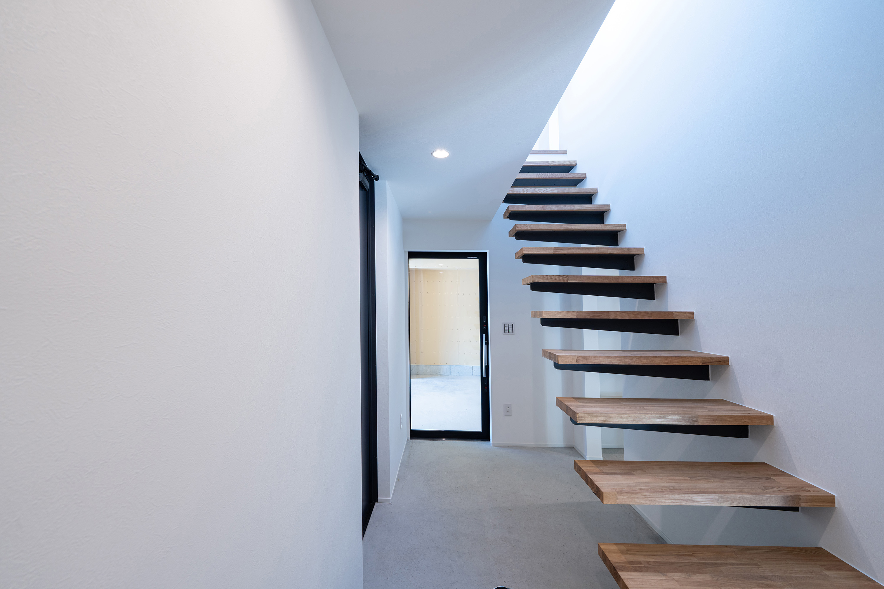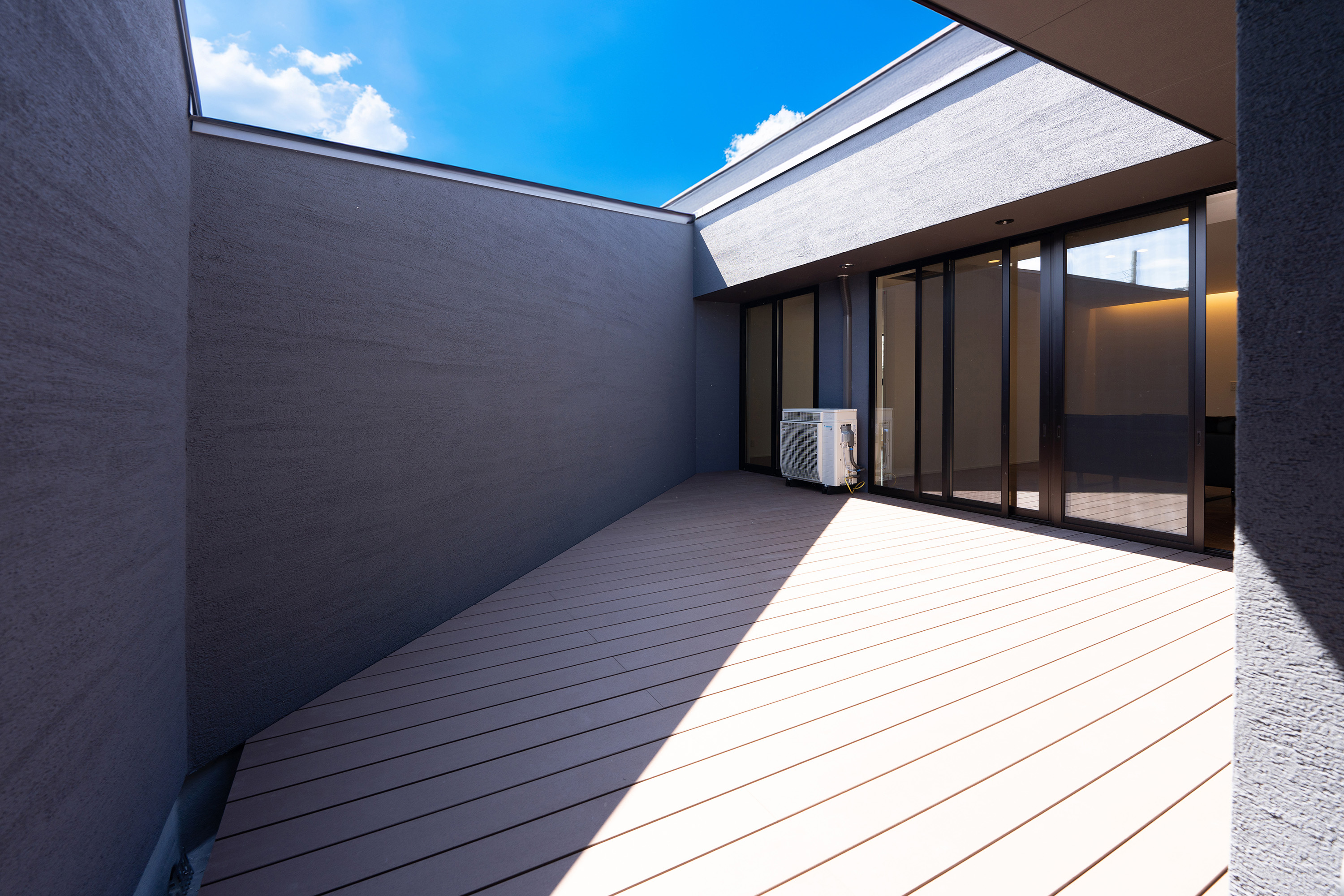 外観はまるで【黒い箱】のような、シックでスタイリッシュな仕上がりになりました。趣味のバイクを存分に楽しめる大きなガレージが特徴の住まいです。自宅用サウナを取り入れ、外気浴ができるように壁を高くしたテラスを設けることで、住宅街にあってもプライベート空間が生まれます。スケルトン階段やシンプルなキッチンなど、無駄を省き洗練された住まいとなりました。