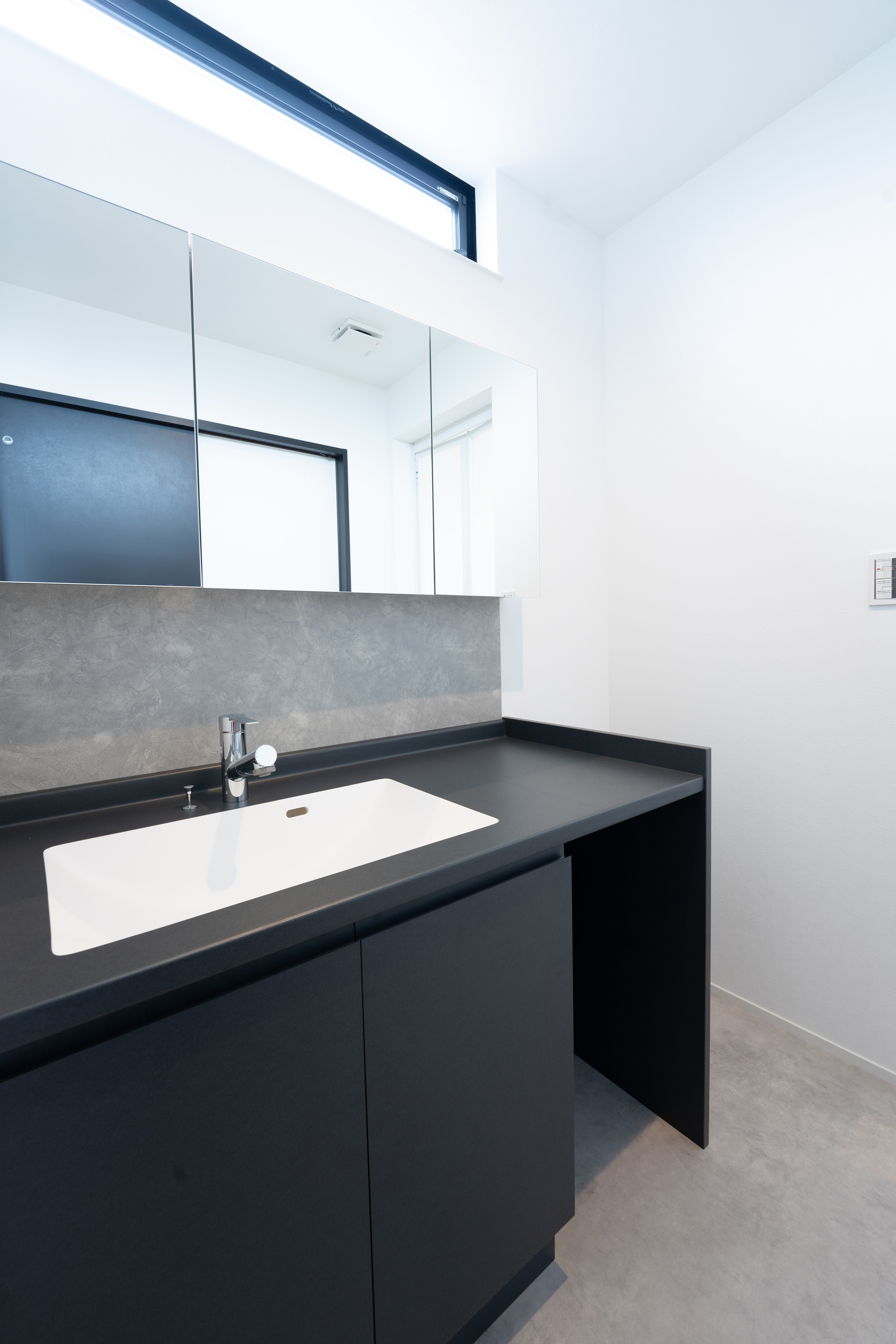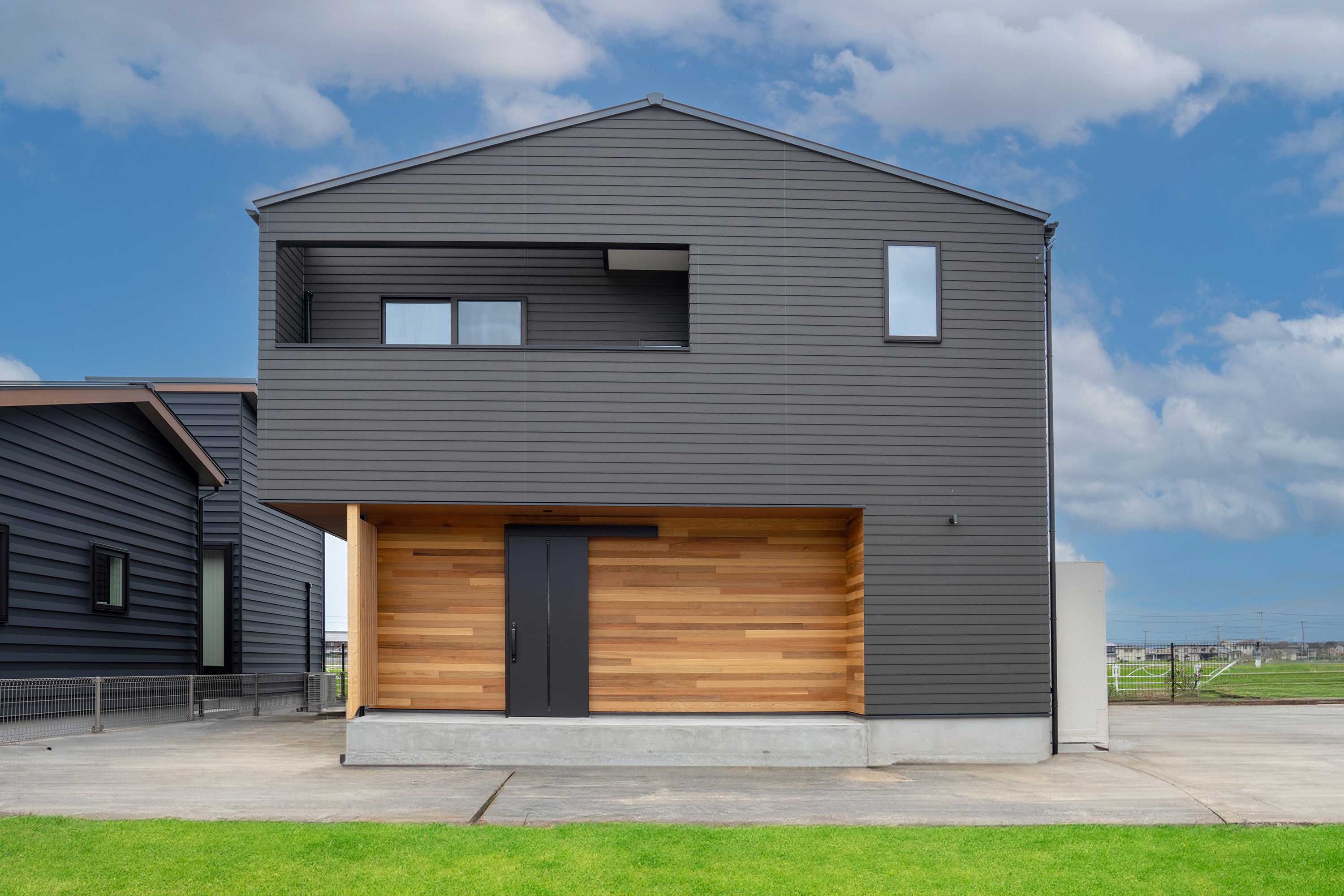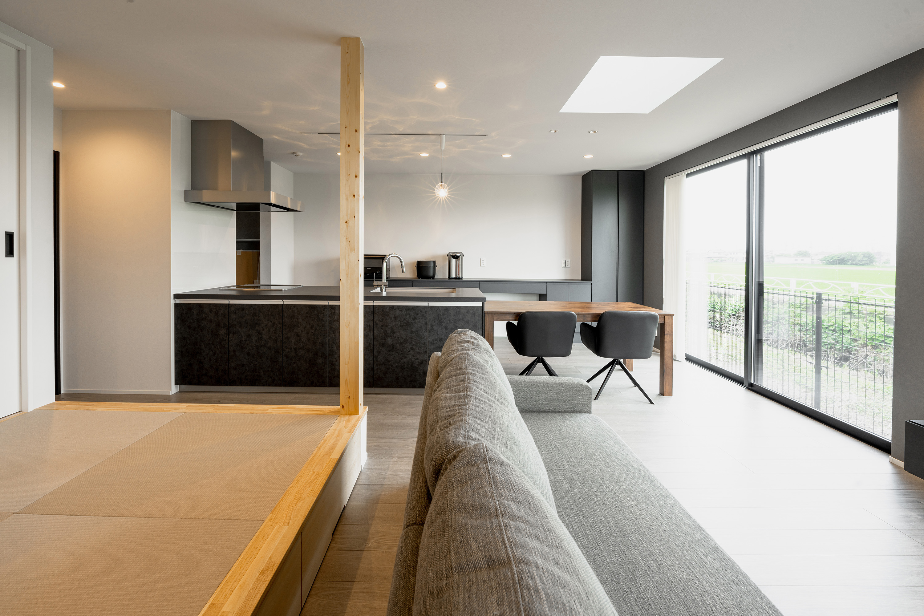 黒の外壁に木材の組み合わせがモダンな佇まいのお宅。玄関ドアは引き戸になっており、開閉のしやすさとスペース効率がメリットです。室内も黒とグレーを基調とした仕上がりになっており、飽きのこないデザインになりました。リビングの後ろには小上がりの畳スペースを設け、お子さんの遊び場やお昼のスペース、家事スペースとして活用できます。デザイン性と機能性を兼ね備えた、モダンスタイルの住まいです。