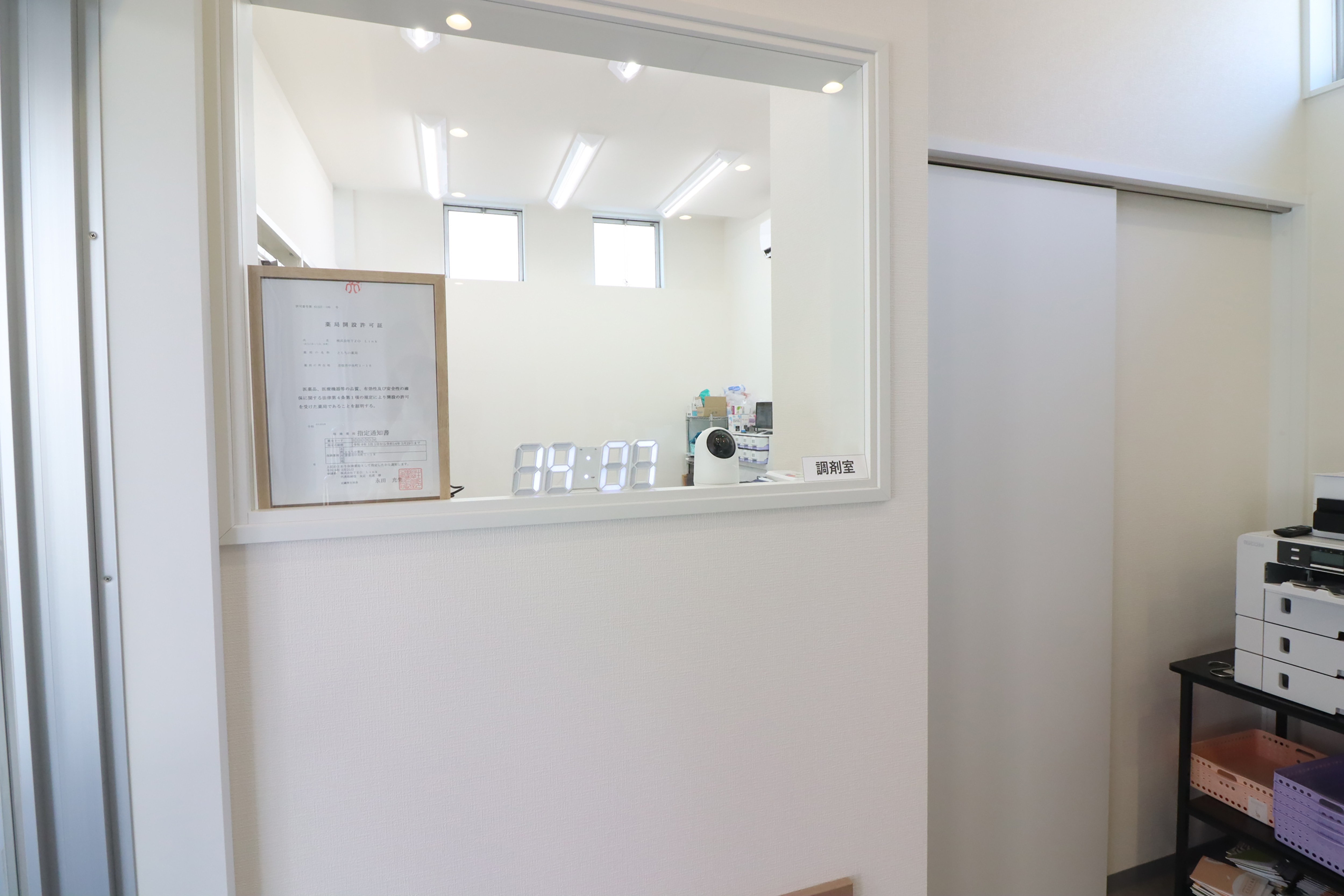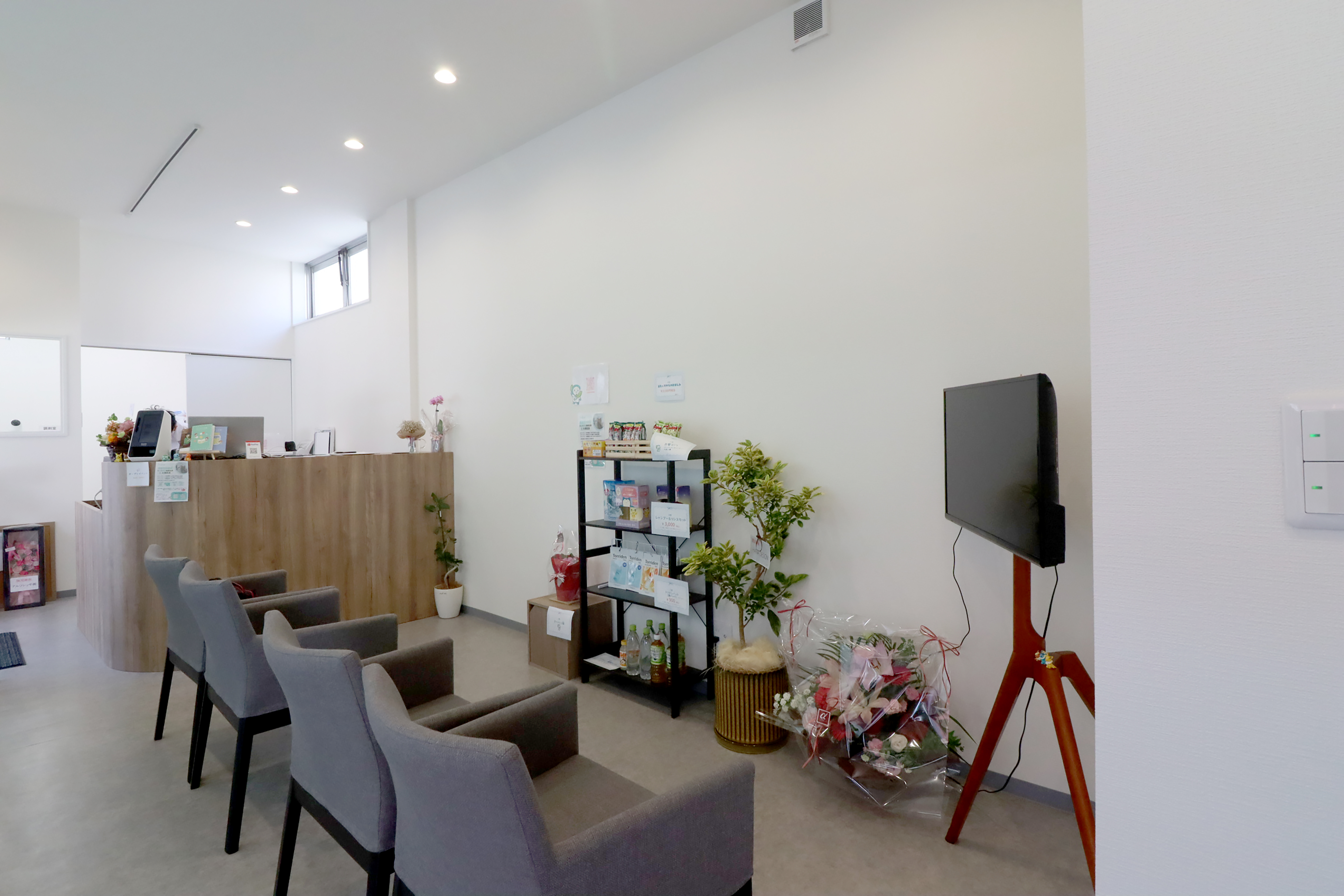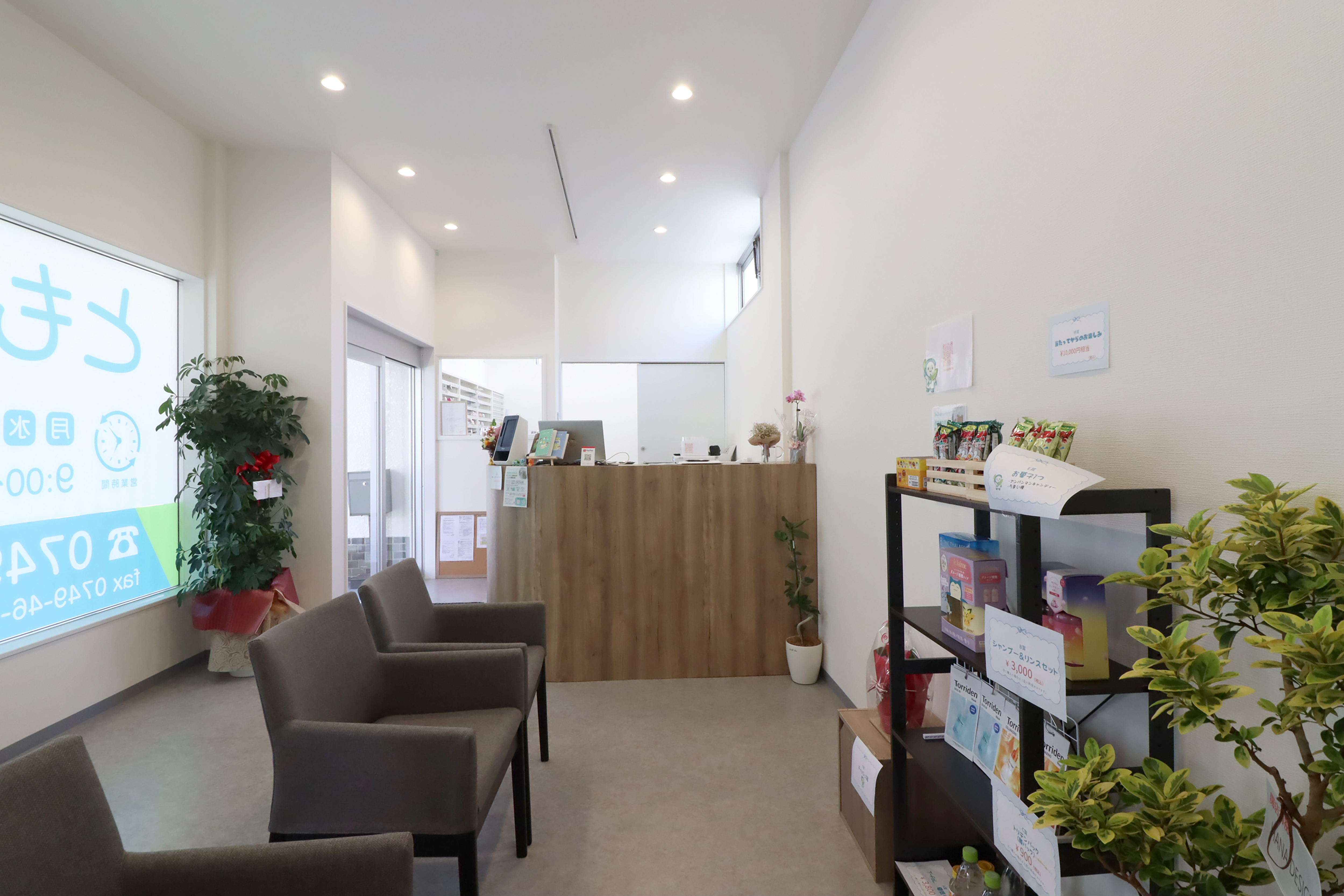 地元に古くから根付く商店街に調剤薬局を施行しました。清潔感のある白を基調に、優しい木目がアクセントとなり温もりを感じられるデザインとなりました。お子様からお年寄りまで、どんな患者様でも過ごしやすい空間に仕上げました。受付を拠点に、右手に待合スペース、奥にスタッフルーム、左手に調剤室があり、横長の細いテナントですが無駄のないレイアウトがとれました。