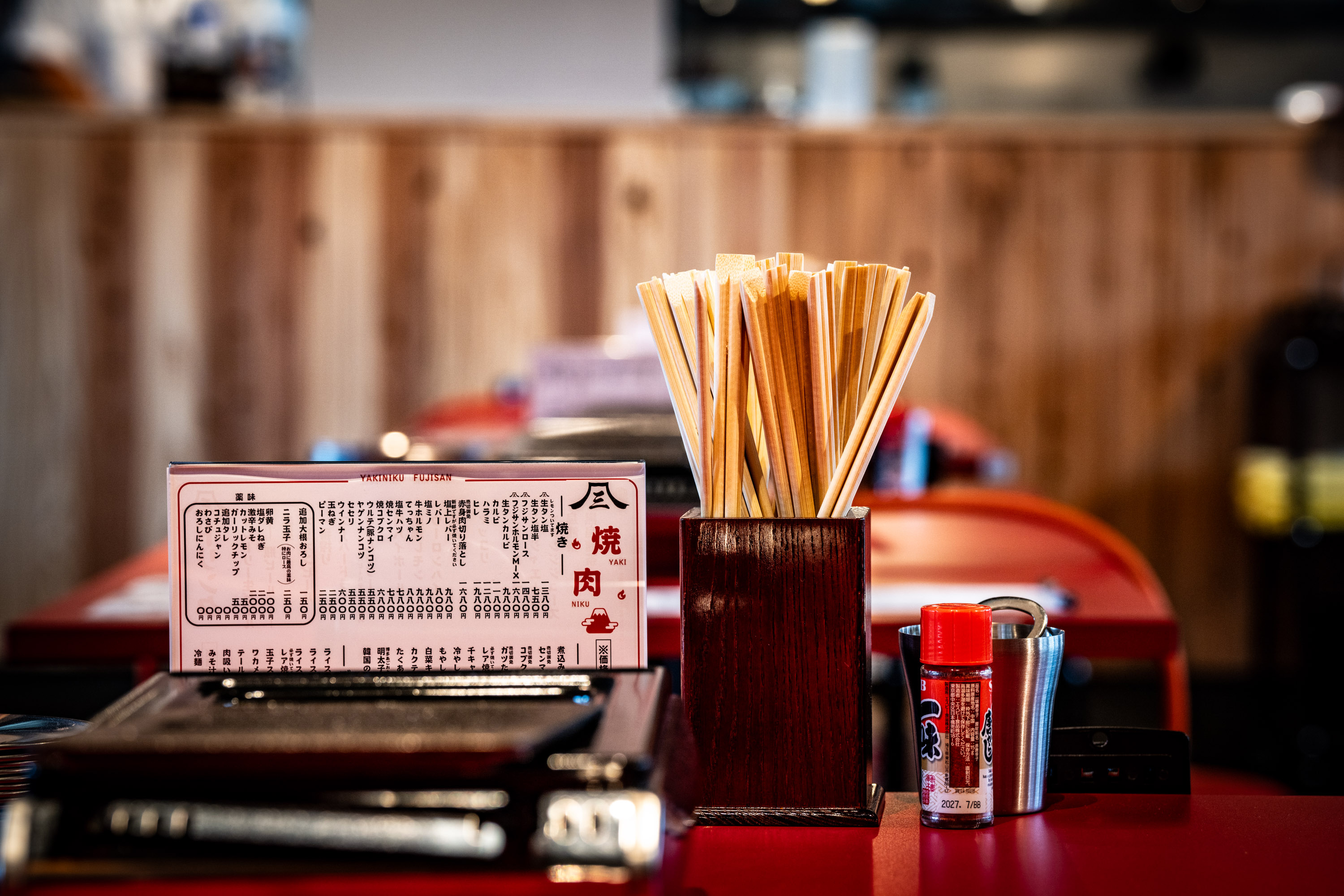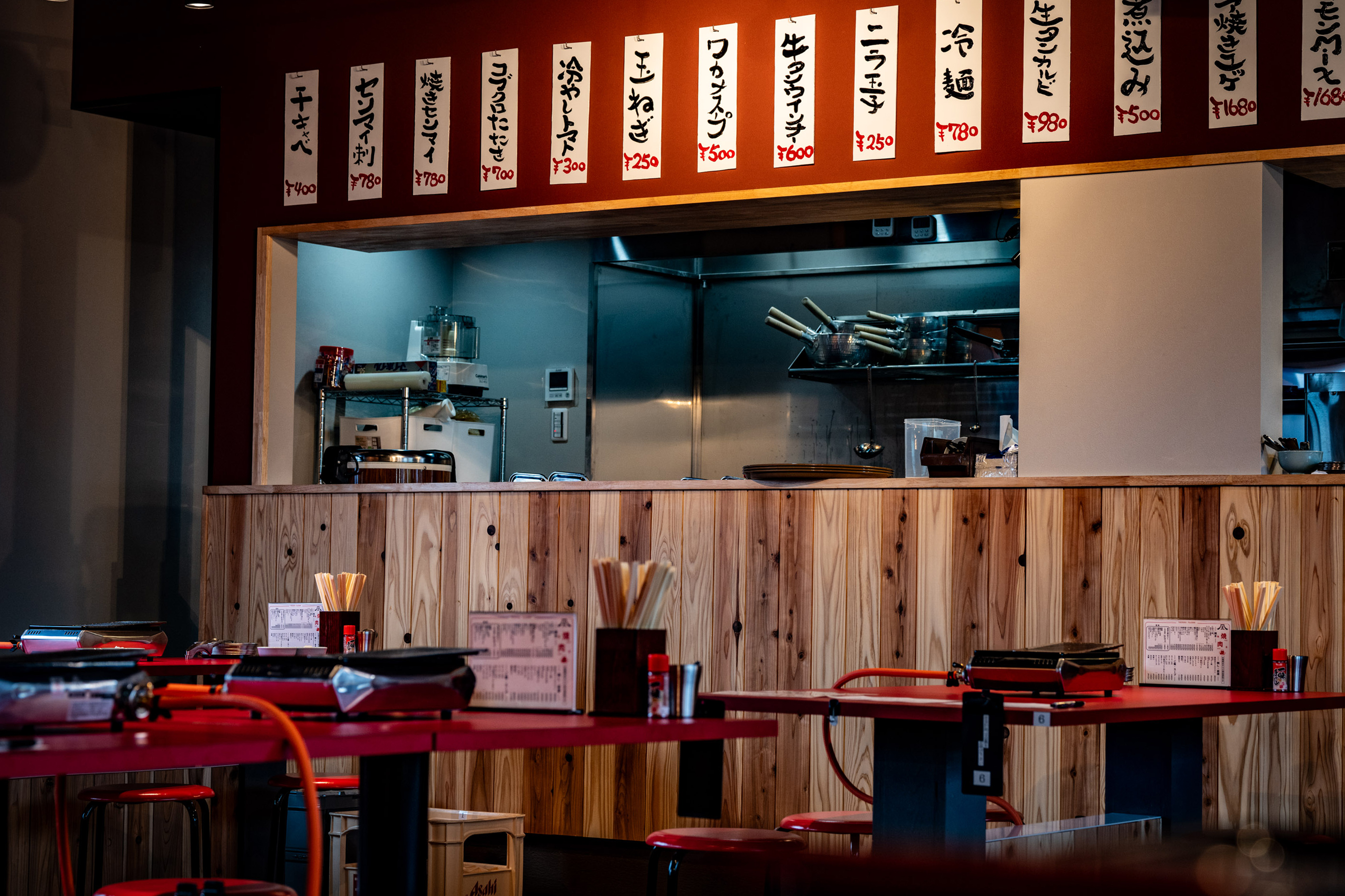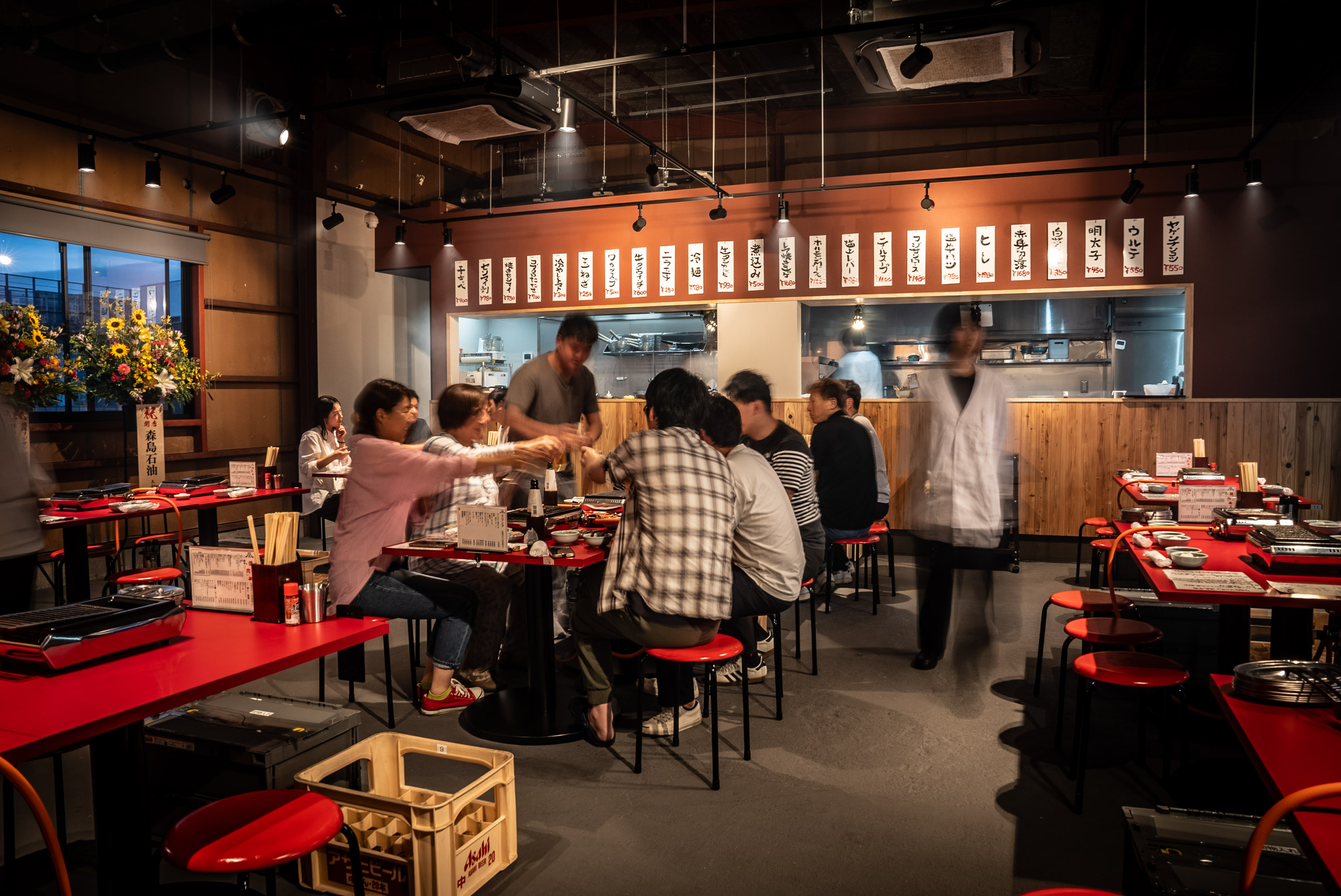 倉庫を改装した店舗は独特の雰囲気をまとい、レトロで無骨な印象がかっこいい仕上がりとなりました。剥き出しの鉄骨やダクトが荒々しく、広くて綺麗なトイレは飲食店には嬉しいポイントです。懐メロが流れ、煙がモクモクと立ち込め、お客様の笑い声と乾杯の音が活気に満ち、肉を焼くいい匂いが漂ってきます。まるでタイムスリップしたかのようなレトロモダンな雰囲気を演出しました。